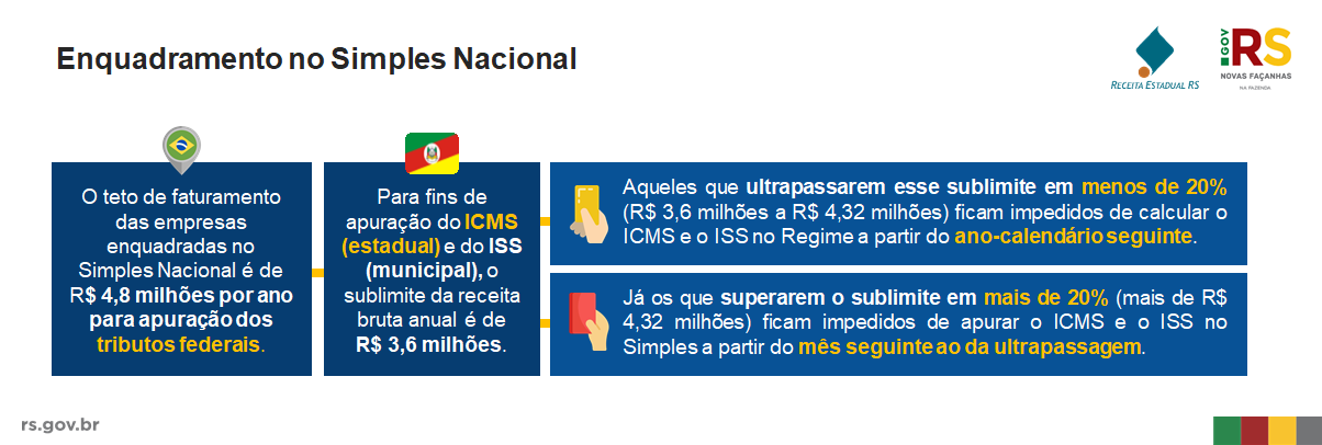 O limite para enquadramento das empresas no Simples Nacional, regime tributário diferenciado, simplificado e favorecido aplicável às Microempresas e Empresas de Pequeno Porte, fixa o teto de faturamento das empresas em R$ 4,8 milhões. Entretanto, conforme alerta a Receita Estadual do Rio Grande do Sul, esse limite somente é válido para a apuração dos tributos federais. Para fins de apuração do ICMS (estadual) e do ISS (municipal), o limite se mantém em R$ 3,6 milhões, conforme art. 13-A da Lei Complementar nº 123/06.