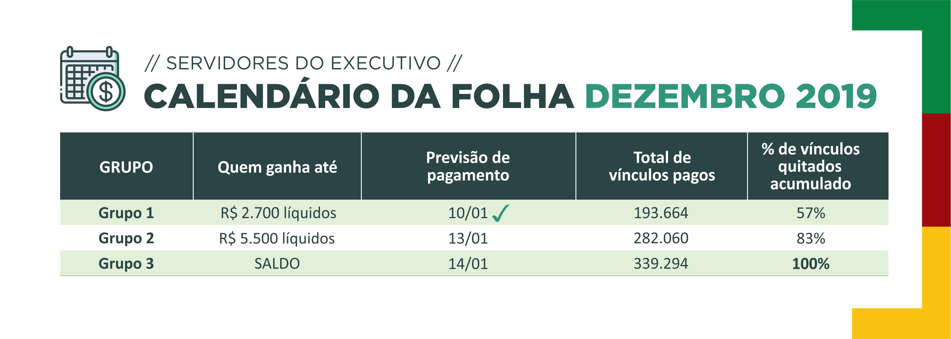 No mês de dezembro, o pagamento do funcionalismo será realizado exclusivamente no sistema de grupos. O próximo depósito está previsto para o dia 13 de janeiro quando serão pagos os contracheques de quem recebe líquido até R$ 5.500 (83% dos vínculos).