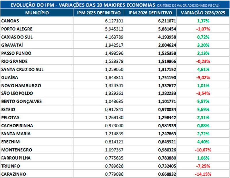 Entre as 20 maiores economias do Estado, conforme o critério de Valor Adicionado Fiscal, 13 municípios registraram crescimento e sete municípios apresentaram queda na comparação do IPM definitivo 2026 com o IPM definitivo 2025. As maiores variações positivas são de Esteio (5,69%), na Região Metropolitana, e de Bento Gonçalves (5,57%), na Serra, enquanto as maiores reduções foram verificadas em Carazinho (-14,15%), no Norte, e em Montenegro (-10,67%), no Vale do Caí.