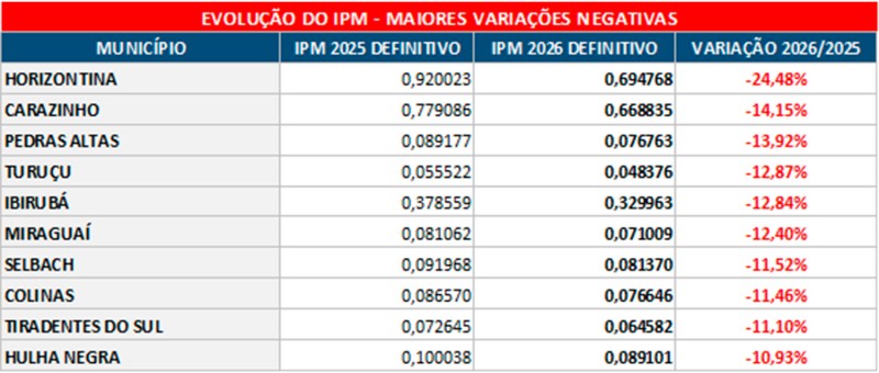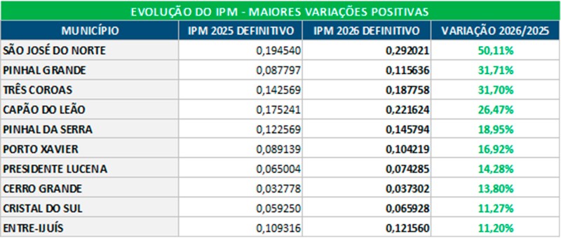 O município de São José do Norte, na Região Sul, lidera a variação mais positiva na comparação do IPM definitivo de 2026 com o IPM definitivo de 2025, com crescimento de 50,11% de um exercício para o outro. A variação mais negativa, por sua vez, foi de Horizontina, no Noroeste, com uma queda de 24,48%. Ao todo, dos 497 municípios do Estado, 256 apresentaram crescimento e 241 registraram diminuição em seus índices.