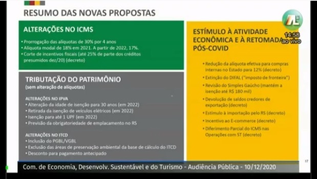 Com o intuito de discutir as medidas que compõem o Projeto de Lei nº 246 (PL 246/2020), representantes do governo do Estado participaram, nesta quinta-feira (10/12), de audiência pública virtual promovida pela Comissão de Economia, Desenvolvimento Sustentável e do Turismo da Assembleia Legislativa.