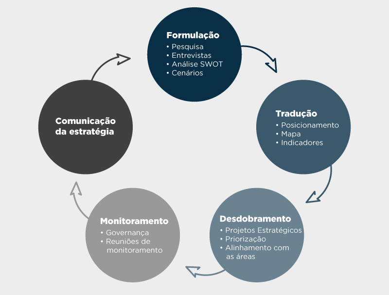 Os três primeiros subprocessos são revisitados a cada quatro anos, na mudança de gestão, ao passo que os dois últimos são executados permanentemente.