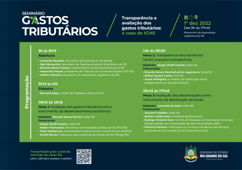 O Seminário Transparência e Avaliação dos Gastos Tributários: o Caso do ICMS será realizado de forma presencial, mas com transmissão simultânea, garantindo acesso à população gaúcha sobre as discussões. Para a abertura do evento, estão confirmadas as presenças do secretário de Fazenda, dos presidentes da Assembleia Legislativa e Tribunal de Contas do Estado. O economista Bernard Appy, ex-secretário-executivo do Ministério da Fazenda e idealizador de proposta de reforma tributária em análise no Congresso Nacional, participará da abertura juntamente com o secretário Leonardo Busatto e o subsecretário Ricardo Neves Pereira.