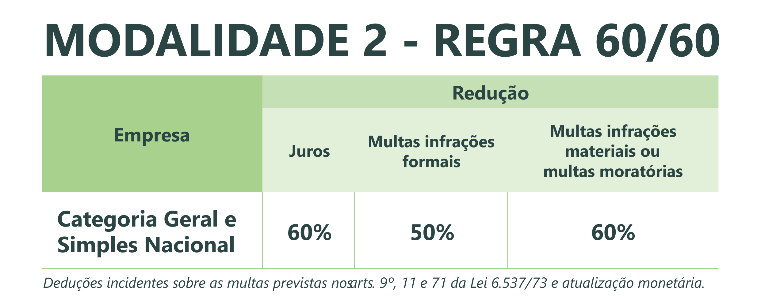 Parcelamento com entrada inferior a 15% do valor do débito – redução de 40% dos juros e desconto de multas que podem chegar a 30% dependendo do número de parcelas escolhidas, que variam de 12 vezes ao máximo de 60 vezes para contribuintes da Categoria Geral e de até 120 vezes para empresas do Simples Nacional).
